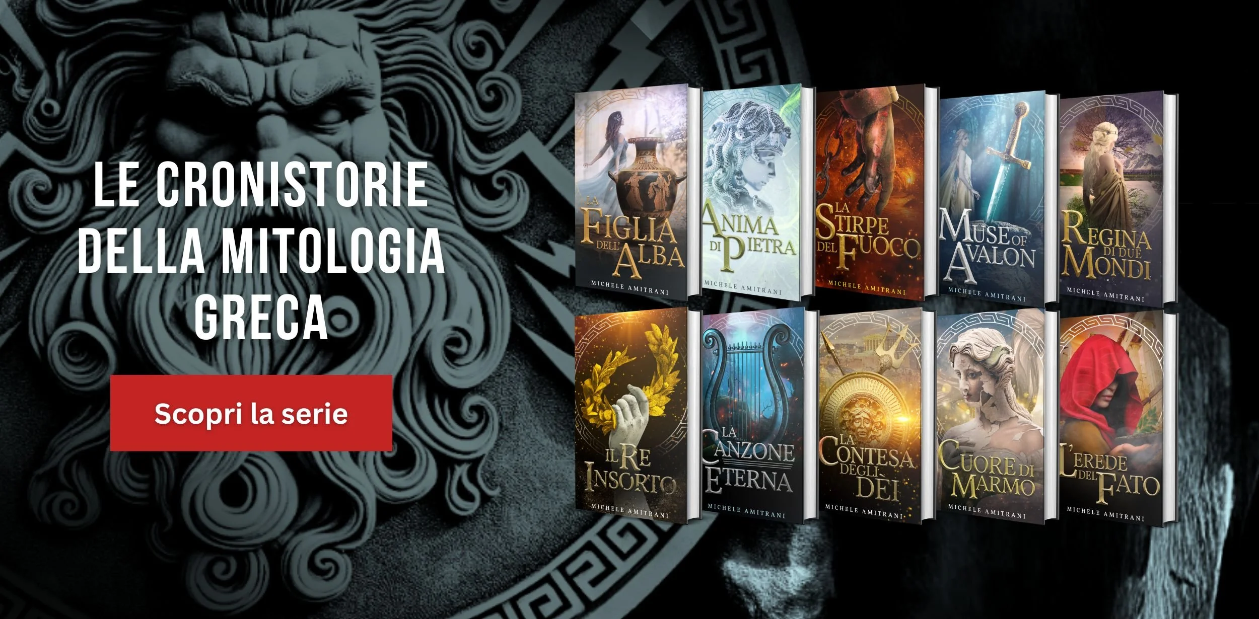 Le Cronistorie della Mitologia Greca è la serie best-seller che esplora i miti e le figure più famose dell’Antica Grecia (da Pandora a Medusa, da Prometeo a Sisifo). Questa imponente saga di Fantasy Mitologico di Michele Amitrani regala una nuova anima alle leggende senza tempo, rendendo dèi, titani e mostri incredibilmente umani e vicini al cuore del lettore.